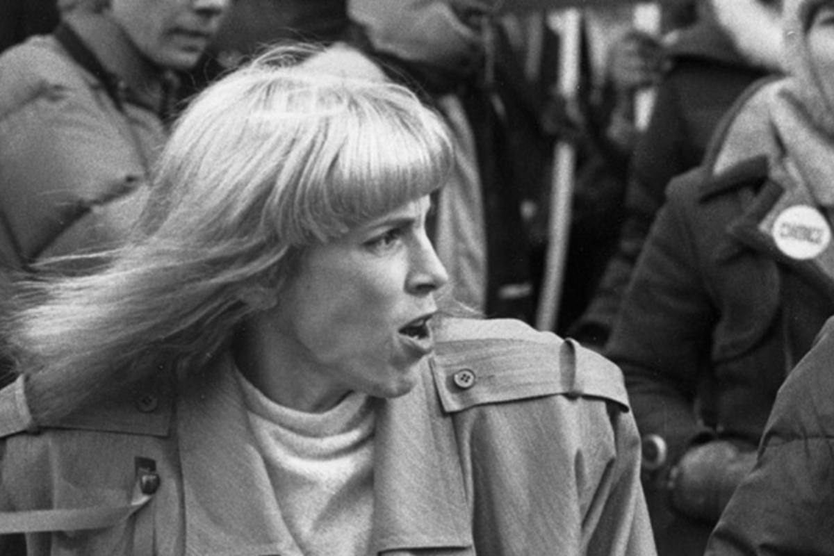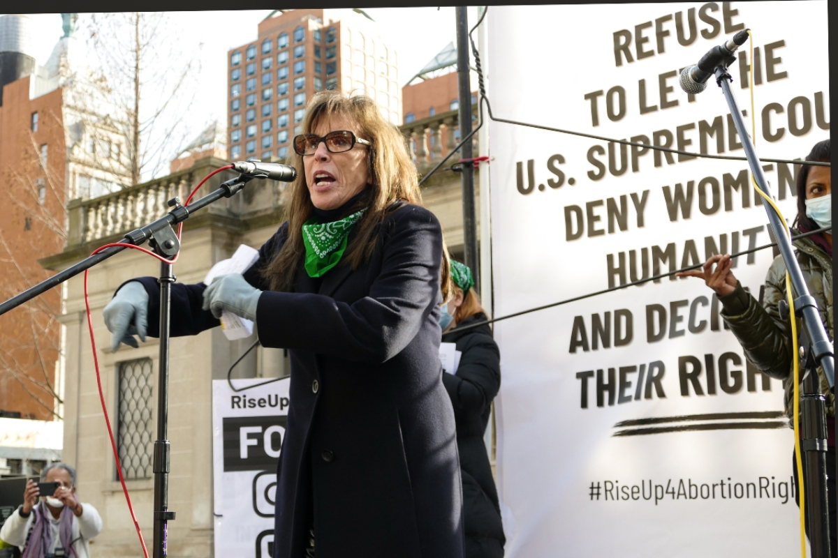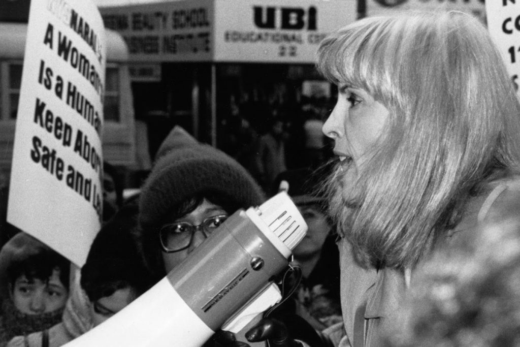 Left: Merle Hoffman at the First Pro-Choice Civil Disobedience, St. Patrick’s Cathedral, 1989. Right: Merle Hoffman speaking at RiseUp4AbortionRights rally at Supreme Court on Roe V. Wade anniversary, Jan 22nd, 2022.